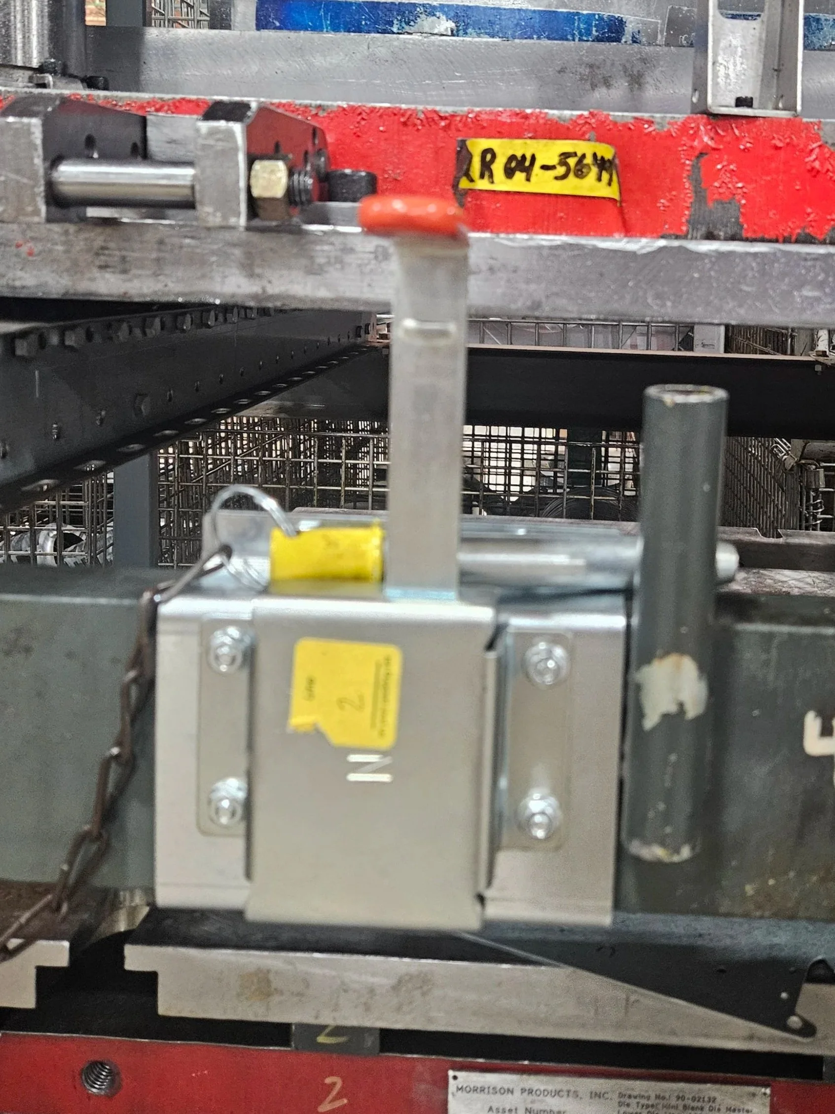 The four images to the right were a latch design I created to prevent dies stored in racks from falling off. Previously, a pin system was utilized, and while effective, operators would frequently dent them when moving dies onto die carts. These pins were welded onto the actual storage racks, so replacement of the bent pins and pin holes took excessive time. My solution was to bolt two plates to the crossbar with a barn latch attached to the front plate through 4 additional bolts. This eliminated the need to remember where to place the loose pin after removal. It also gave a better visual aid of the latch being in the way with the orange handle. The replacement of the latches was also simpler, as only four nuts needed to be taken off to remove the bent latch, and the actual plates could stay on.